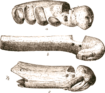 Fig. 304.—Pickax heads of bone, ivory, and whale’s ribs.