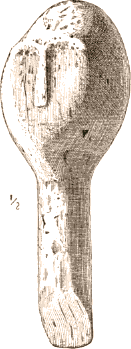 Nordenskiöld mentions and figures a scoop of almost identically the same pattern, but smaller, in general use for the same purposes at Pitlekaj.417 A smaller scoop or skimmer (ĕlauatĭn) is also universally used. We inadvertently neglected to preserve a specimen of this very common implement, though we had two or three about the station for our own use. I shall therefore have to describe it from memory. The handle is a flat, straight stick with rounded edges, about 18 inches or 2 feet long, 1½ inches broad, and three-fourths inch thick. The bowl is made of two pieces of antler “palm” of such a shape that when they are fastened together on the end of the stick they make a shallow cup about 3½ inches long by 3 wide, with a longitudinal crevice along the middle which allows the water to drain off. The tip of the handle is beveled off on both sides so as to fit into the inside of this cup, along the junction of the two pieces, each of which is fastened to it by one or two neat stitches of whalebone. The two pieces are fastened together in front of the handle with a stitch.