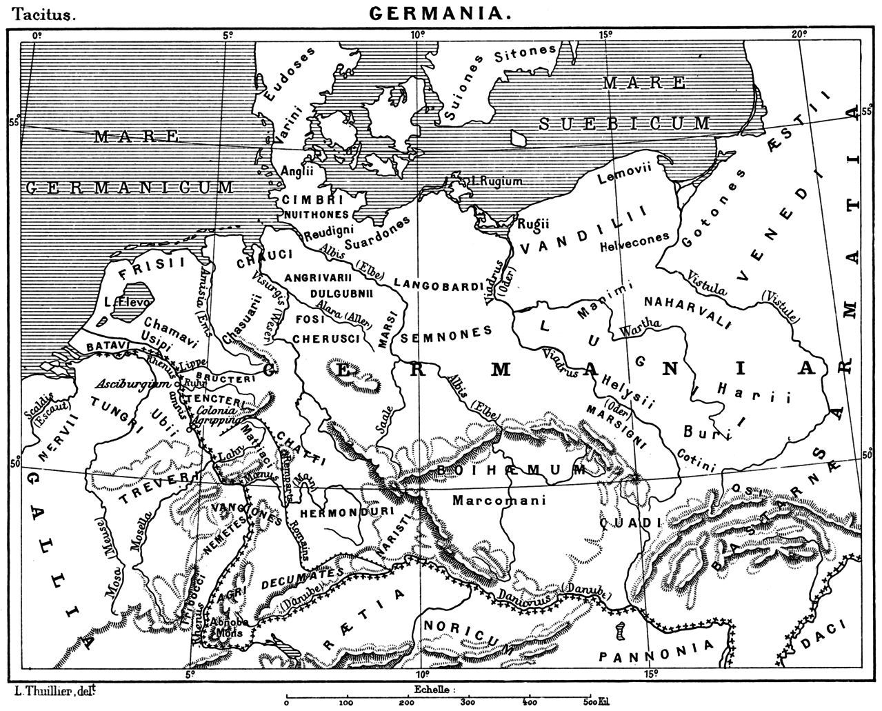 1. Position et géographie physique de la Germanie. 2. Origine des anciens peuples de la Germanie et légendes qui s’y rapportent. 3. Suite des traditions antiques, le Bardit. 4. Pureté de la race; le physique des Germains. 5. Productions du sol; mépris de l’or et de l’argent.