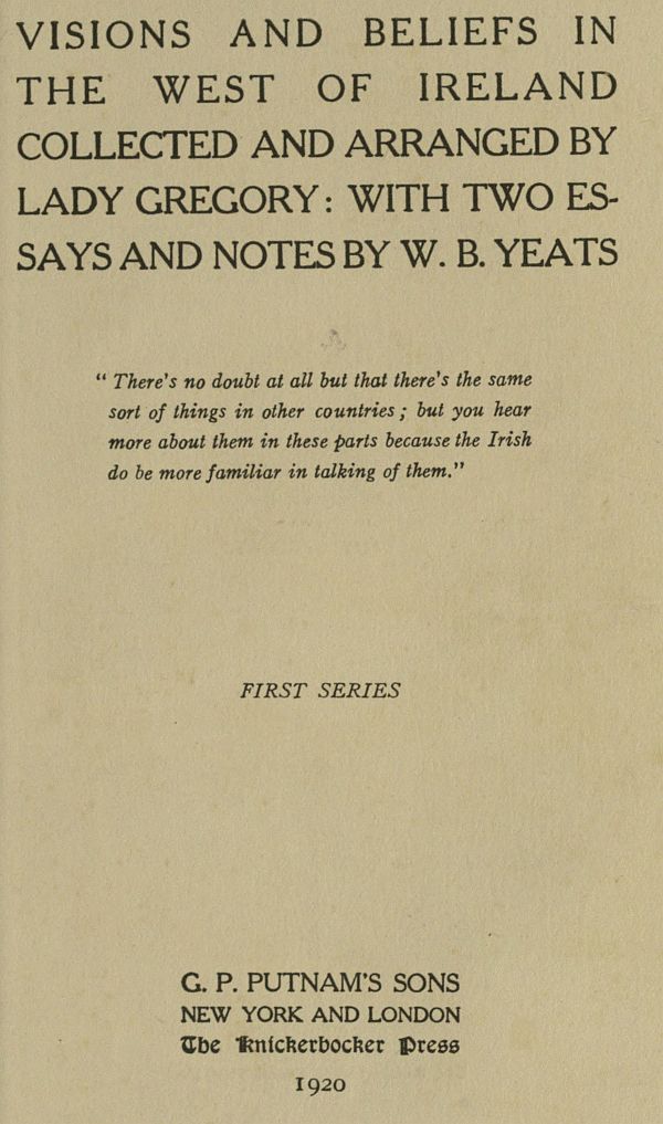 "The Celtic Twilight" was the first book of Mr. Yeats's that I read, and even before I met him, a little time later, I had begun looking for news of the invisible world; for his stories were of Sligo and I felt jealous for Galway. This beginning of knowledge was a great excitement to me, for though I had heard all my life some talk of the faeries and the banshee (having indeed reason to believe in this last), I had never thought of giving heed to what I, in common with my class, looked on as fancy or superstition. It was certainly because of this unbelief that I had been told so little about them. Even when I began to gather these stories, I cared less for the evidence given in them than for the beautiful rhythmic sentences in which they were told. I had no theories, no case to prove, I but "held up a clean mirror to tradition."