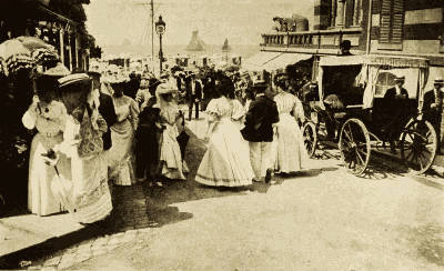 "My dear, just look at those petticoats and stockings!" she gasped. "The creatures haven't any idea of hiding them. I've been watching for two mortal hours and there hasn't been a let-up yet. Some are finer than others, that's all. But they're all showy, and every single woman has her dress tucked up so[Pg 19] you can't miss them. When I saw the first ones I thought I'd struck the French women you read about,—the ones who aren't proper, you know, and I was so interested; but then they kept coming so steadily that I got all mixed up. Hundreds have gone by, all holding their skirts like that and every one of them swishing silk or lace ruffles and showing silk stockings,—and it isn't humanly possible, even in Paris, that they're all bad, now is it?"