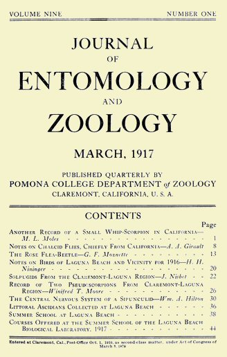 Project Gutenberg's Journal of Entomology and Zoology, March 1917, by Various This eBook is for the use of anyone anywhere in the United States and most other parts of the world at no cost and with almost no restrictions whatsoever. You may copy it, give it away or re-use it under the terms of the Project Gutenberg License included with this eBook or online at www.gutenberg.org. If you are not located in the United States, you'll have to check the laws of the country where you are located before using this ebook. Title: Journal of Entomology and Zoology, March 1917 Author: Various Release Date: January 28, 2015 [EBook #48101] Language: English Character set encoding: ISO-8859-1 *** START OF THIS PROJECT GUTENBERG EBOOK JOURNAL OF ENTOMOLOGY, ZOOLOGY, MAR 1916 *** Produced by Larry B. Harrison, Tom Cosmas and the Online Distributed Proofreading Team at http://www.pgdp.net from images made available on The Internet Archive (https://archive.org/).