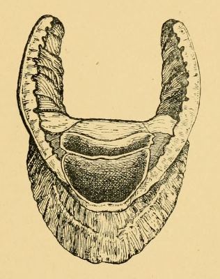 The inner surface presents a finely pitted appearance which is most marked at the toe and round its border. The part immediately related to the frog shows few pits, and we shall find that the whole surface corresponds to the sensitive parts to which it is attached.