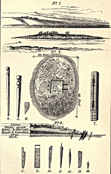 | Pins of iron, bronze, bone, and wood, &c. Iron shears and knives. Combs of bone and wood. Bronze tweezers. Stone and bronze ornaments: brooches, penannular rings, circlets, &c. Touchstones. Crucibles. Ornaments of gold and silver. Rings of stone, jet, and glass. Beads of stone, bone, jet, lead, earthenware, wood, and glass. | |