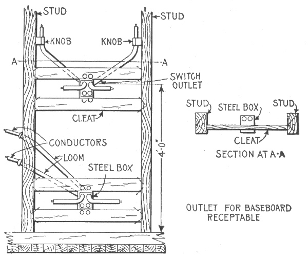 The term "wiring"—open or exposed wiring—selection of wires—installation—disadvantages of open wiring—splicing—pitch of wires—crossing of wires—wiring across pipes—practical points relating to exposed wiring—methods of carrying wires, through floors; on walls—protecting exposed wiring on low ceilings—various porcelain knobs and cleats—wires used in mouldings—standard wooden moulding—kick box—usual character of moulding work—practical points relating to wiring in mouldings—tapping outlets—arc light wiring—arc lamps on low pressure service—circular fixture block—concealed knob and tube wiring; objections; method of installation—arrangement of switch and receptacle outlet in knob and tube wiring—switch boxes—rigid conduit wiring; advantage—types of rigid conduit; requirements—-conduit box—disadvantages of unlined conduit—flexible conduit wiring—Greenfield flexible steel conduit—"fishing"—insulating point—canopy insulator—fish plug and method of insertion—method of installing conduits in fireproof buildings—service entrance to rubber conduit system—condulet outlet to arc lamp—hickey—methods of bending large conduits—armoured cable wiring; features; installation.
