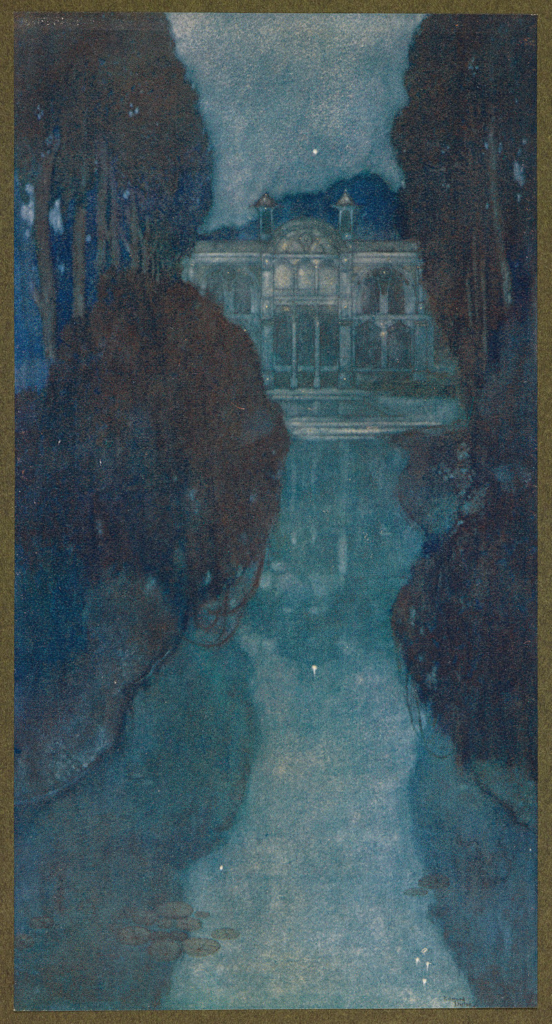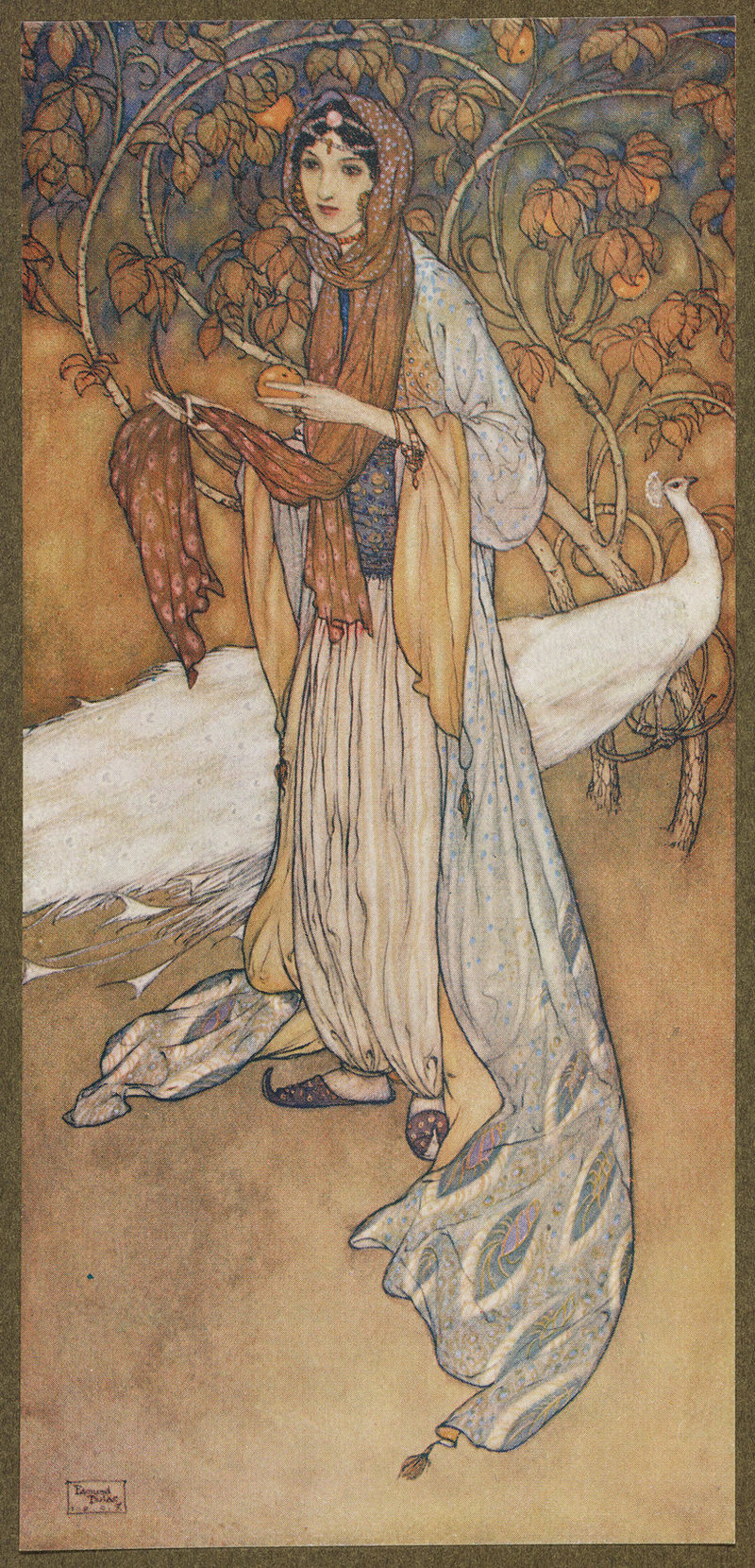 The cook meanwhile, proud of an opportunity to exhibit her culinary skill on dainties so rare, scaled and cleaned the fish and laid them in a frying-pan over the fire. But scarcely had she done so when the wall of the kitchen divided, and there issued forth from it a damsel of moon-like beauty richly apparelled, holding a rod of myrtle in her hand. With this she struck the fish that lay in the frying-pan, and cried—