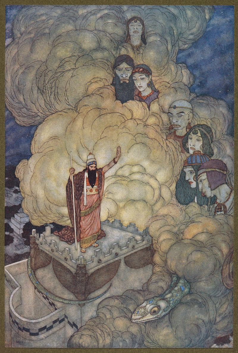 Thus reckoning, he prised out the stopper with his knife, and turning the vessel upside down looked for the contents to follow. Great was his astonishment when nothing but smoke came out of it. The smoke rose in a thick black column and spread like a mist between earth and sky, till presently, drawing together, it took form; and there in its midst stood a mighty Genie, whose brows touched heaven while his feet rested upon ground. His head was like a dome, his hands were like flails, and his legs like pine trees; his mouth was black as a cavern, [Pg 3]his nostrils were like trumpets, his eyes blazed like torches, and his wings whirled round and over him like the simoom of the desert.