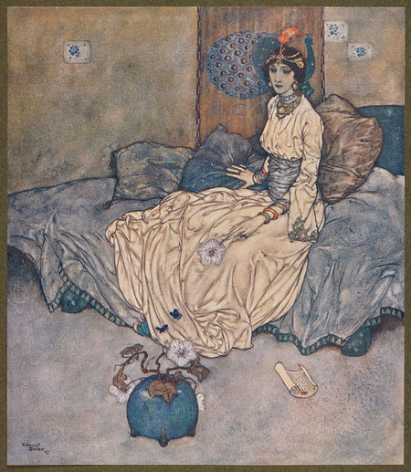 Scheherazadè, the heroine of the Thousand and one Nights, ranks among the great story-tellers of the world much as does Penelope among the weavers. Procrastination was the basis of her art; for though the task she accomplished was splendid and memorable, it is rather in the quantity than the quality of her invention—in the long spun-out performance of what could have been done far more shortly—that she becomes a figure of dramatic interest. The idea which binds the stories together is greater and more romantic than the stories themselves; and though, both in the original and in translation, the diurnal interruption of their flow is more and more taken for granted, we are never quite [Pg vi]robbed of the sense that it is Scheherazadè who is speaking—Scheherazadè, loquacious and self-possessed, sitting up in bed at the renewed call of dawn to save her neck for the round of another day. Here is a figure of romance worth a dozen of the prolix stories to which it has been made sponsor; and often we may have followed the fortunes of some shoddy hero and heroine chiefly to determine at what possible point of interest the narrator could have left hanging that frail thread on which for another twenty-four hours her life was to depend.