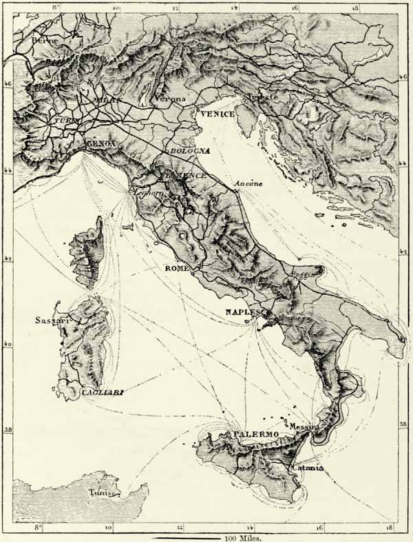 The wide range of the Alps and of their advanced chains thus separated two distinct worlds, in which historical development went on at a different rate. At the same time, the separation between the two slopes of the Alpine system was by no means complete. Nowhere in the Alps do we meet with cold and uninhabited plateaux, as in the Andes and in Tibet, whose enormous extent forms almost insurmountable barriers. The Alpine masses are cut up everywhere into mountains and valleys, and the climate of the latter is sufficiently mild to enable man to exist in them. The mountaineers, who easily maintained their independence, owing to the protection extended to them by nature, first served as intermediaries between the peoples inhabiting the opposite lowlands. It was they who effected the rare exchanges of produce which took place between the North and South, and who opened the first commercial high-roads between the summits of the mountains. The direction of the valleys and the deeply cut mountain passes even then indicated the grand routes by which the Alps would be crossed, at a future period, for the purposes of commerce or of war. That portion of the Alps which lies between the mountain masses of Savoy and of the Mediterranean would naturally cease first to form an obstacle to military expeditions. The Alps there are of great height, it is true, but they are narrower than anywhere else; besides which, the climate on the two opposite slopes is similar, and assimilates the mode of life and the customs of the people dwelling there. Far more formidable, as a natural barrier, are the Alps to the north-east of Mont Blanc, for they constitute a climatic boundary.