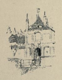 As every one who has passed in the Paris train knows, at the entrance of the town is the town-gate, a heavy grey pile, with high-gabled roof and drawbridge, the chains of which hang on either side the archway. Now that Dessein’s was gone, J—— declared that it interested him more than anything else in Calais, since Hogarth had painted it; and he began an elaborate study. It was not easy work. To the people in their holiday humour the combination of knee-breeches and sketch-book was irresistibly comic. But he went bravely on. I have rarely seen him more conscientious over a sketch. Indeed he was so pleased with this gate that later, when, at the end of a street, we came to another, under a tall[26] turreted house, and leading into a large courtyard, nothing would do but he must have that as well.—In a word, he was in a mood to draw as many gates as he could find; but by this time at the Hôtel Meurice dinner was on the table.