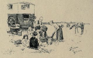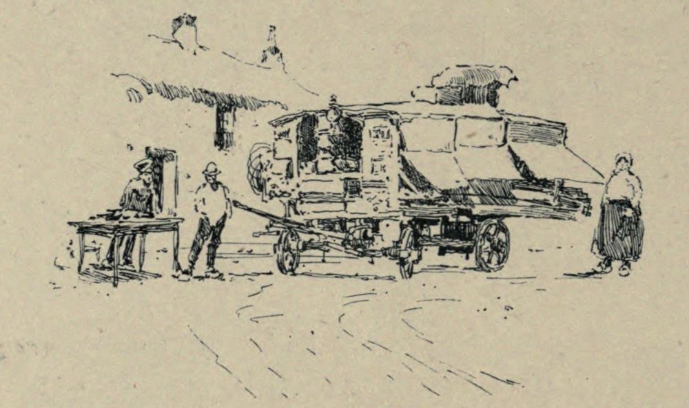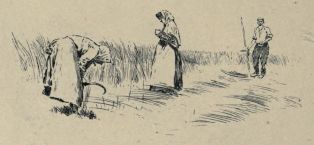 Though we thought this a rare jest at the time, we carried his advice out almost to the letter.—We had come to the terrible mountains for which we had been prepared in Calais. It is at this point, according to Mr. Ruskin, that France really begins, the level stretch we first crossed being virtually but part of Flanders. ’Tis a bad beginning, from a cycler’s ideal. For many miles I walked—and even J—— at times—along the white road, barren of the poplars one always expects in France, over the rolling treeless moors, where we were watched[32] out of sight by gleaners, their white caps and dull blue skirts and sacks in pale relief against a grey blue-streaked sky; and by ploughmen, whose horses, happier than they, ate their dinners as they worked.—Always to the north of the moorland was the grey sea-line, and farther still the white cliffs of England.