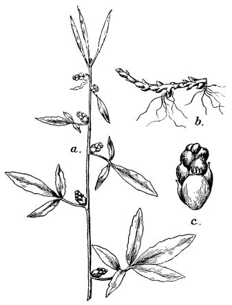 a, Upper half of shoot, 1/2; b, creeping stem, 1/2; c, bulbil, 2/1.