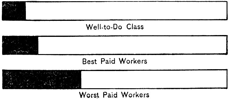 Poverty and Death are grim companions. Wherever there is much poverty the death-rate is high and rises higher with every rise of the tide of want and misery. In London, Bethnal Green’s death-rate is nearly double that of Belgravia;[2] in Paris, the poverty-stricken district of Ménilmontant has a death-rate twice as high as that of the Elysée;[3] in Chicago, the death-rate varies from about twelve per thousand in the wards where the well-to-do reside to thirty-seven per thousand in the tenement wards.[4] The ill-developed 6bodies of the poor, underfed and overburdened with toil, have not the powers of resistance to disease possessed by the bodies of the more fortunate. As fire rages most fiercely and with greatest devastation among the ill-built, crowded tenements, so do the fierce flames of disease consume most readily the ill-built, fragile bodies which the tenements shelter. As we ascend the social scale the span of life lengthens and the death-rate gradually diminishes, the death-rate of the poorest class of workers being three and a half times as great as that of the well-to-do. It is estimated that among 10,000,000 persons of the latter class the annual deaths do not number more than 100,000, among the best paid of the working-class the number is not less than 150,000, while among the poorest workers the number is at least 350,000.[5] The following diagram illustrates these figures clearly and needs no further comment:—