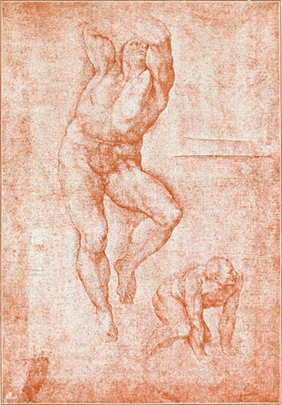 Dem sorgenfreien und anregenden Leben an dem glanzvollen Mediceerhofe machte der Tod Lorenzos des Herrlichen (am 8. April 1492) ein Ende. Michelangelo kehrte in das Haus seines Vaters zurück. Er kaufte einen unbenutzt liegenden Marmorblock und meißelte daraus einen Herkules. Dieses überlebensgroße Standbild kam im Palazzo Strozzi zur Aufstellung; 1529 wurde es verkauft und von seinem neuen Besitzer an König Franz I von Frankreich geschickt; im XVII. Jahrhundert stand es in einem Garten von Fontainebleau; dieser Garten wurde 1713 zerstört, um für neue Anlagen Platz zu schaffen, und Michelangelos bewunderter Herkules ist seitdem verschwunden. Verschwunden ist auch ein kleines Bildwerk, welches Michelangelo im Jahre 1494 ausführte: ein hölzernes Kruzifix, das auf dem Hochaltar der Kirche S. Spirito zu Florenz aufgestellt wurde. Der Prior von S. Spirito bewies dem jungen Künstler seine Dankbarkeit, indem er ihm im Kloster mehrere Zimmer zur Verfügung stellte, wo derselbe ungestört seinem Wissensdrang Genüge thun und durch das Zergliedern von Leichen sich eine eingehende Kenntnis vom Bau des menschlichen Körpers verschaffen konnte. Michelangelo betrieb das Studium der Anatomie mit großer Gründlichkeit; dasselbe ersetzte ihm beinahe gänzlich das Studium nach dem lebenden Modell. Unter den Zeichnungen, welche sich von seiner Hand[S. 5] erhalten haben, finden sich mehrfach anatomische Skizzen (Abb. 6). Sogenannte Aktstudien nach dem Leben kommen verhältnismäßig selten vor; sie sind aber wundervoll ausgeführt und bekunden auch ihrerseits das gediegenste anatomische Wissen (Abb. 3). Die größte Mehrzahl der Studienblätter Michelangelos — gleichviel ob sie seiner Jugendzeit oder seinem Alter angehören — lassen erkennen, daß der Meister aus dem Gedächtnis, auf Grund seiner vollkommenen Kenntnis der Knochen und Muskeln, sich über die gerade in Frage kommende Ansicht eines menschlichen Körpers oder Körperteils Rechenschaft zu geben gesucht hat; die Haut erscheint dabei sozusagen nur wie ein dünner Überzug über den formbestimmenden Teilen (Abb. 4).