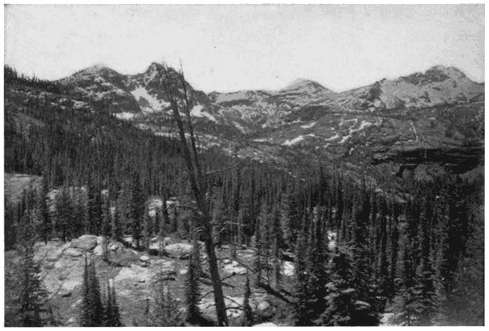The point of view is on Trinchera Creek looking north from an altitude of about 8000 feet. To the left is the San Luis Valley through which flows the Rio Grande, and to the right are the two high passes known as Veta and Sangre de Cristo. The Sierra Blanca forms the southern end of the Sangre de Cristo Range and was one of the great landmarks of the Wilderness.