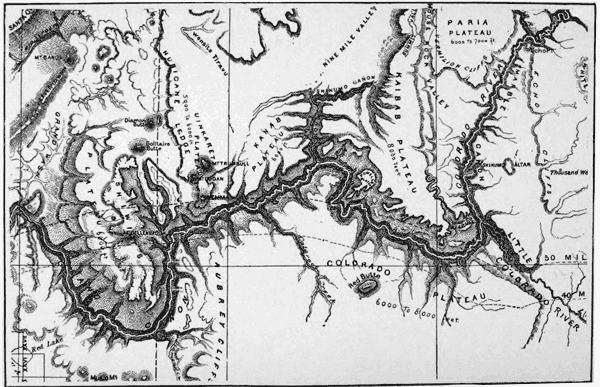 With the Wilderness, however, I can claim some degree of familiarity, for I may be said to have been "in at the death," as I was one of Powell's companions down the Colorado on his second voyage, 1871-72, and have been over portions of almost every one of the principal historical trails. I have travelled there on foot, on horseback, by boat, by waggon, and by railway,—even by Pullman "Palace" car. I have lived under its open sky through summers and through winters; its snows, its rains, its burning heat, have baptised me one of its children. In some cases my footsteps have been among the first of our race to break the surface; and if I have not visited every nook and corner of it during the last thirty four years it is the fault of my purse, not of my spirit.