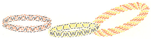 The directions already given apply equally well to all of the following projects. Six-strand standard gimp bracelets are made like five-strand bracelets with an additional 12″ strand on the core. Wood core napkin rings like that shown above require three, four, or five 8″ core strands and a 3 yd. weaving strand. Napkin rings made on shortened ¼″ bands (6″ between the notches) require either five or six 8″ standard gimp core strands and a 2¼ yd. weaving strand. Narrow band bracelets of the type shown at the top of the page can be made of standard gimp with three or four 12″ core strands and a 2¼ yd. weaving strand. Narrow band napkin rings require three or four 8″ core strands and a 1¾ yd. weaving strand.