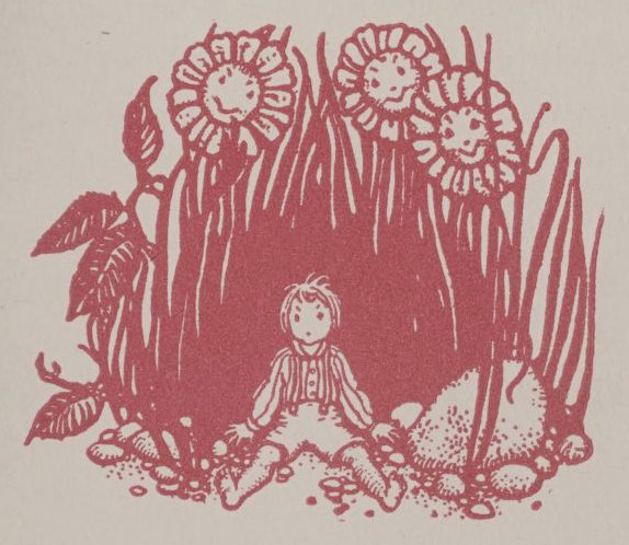 He sat down with surprise, hands on the ground and feet apart, and the short grasses closed above his head. All around him the daisies, who always enjoy a joke, were tittering and looking at him through the grass. Somewhere behind a huge fuzzy mullen-plant was a great noise, like the motor of an aeroplane—it was the bumble-bee, coming to see what was going on.