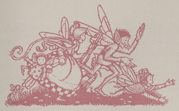 Behold what happened to Birdling! He did not know that the witch-hazel flowers were full of Fairy Bread! Suddenly he grew smaller and smaller, like a candle on a birthday-cake, till he thought he must go out altogether—but just before it was time to go out he stopped shrinking and saw to his great relief that he was still a good inch taller than the bumble-bee.