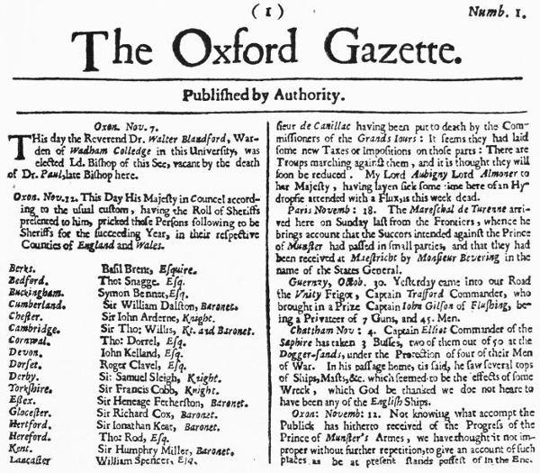 Upper part of the first page of the Oxford (now London) Gazette, 1665. The oldest newspaper still existing in England