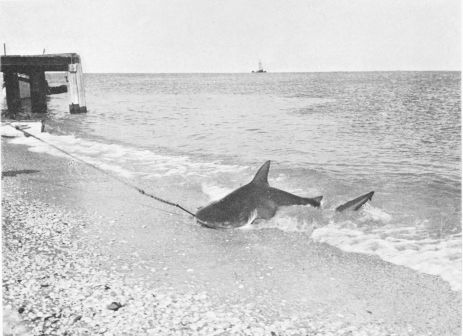 The infuriated fish tows the boat in all directions. It is too heavy to haul in, and must be got ashore. This is not very difficult, for you let it run free when heading in that direction, and check it when making a move for deeper water. At last it is beached. There is no occasion to cut out the harpoon, for all you need do is to thrust in your finger and press up the barb on either side, and it comes away at once.{94}