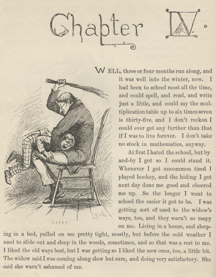 At first I hated the school, but by and by I got so I could stand it. Whenever I got uncommon tired I played hookey, and the hiding I got next day done me good and cheered me up. So the longer I went to school the easier it got to be. I was getting sort of used to the widow's ways, too, and they warn't so raspy on me. Living in a house and sleeping in a bed pulled on me pretty tight mostly, but before the cold weather I used to slide out and sleep in the woods sometimes, and so that was a rest to me. I liked the old ways best, but I was getting so I liked the new ones, too, a little bit. The widow said I was coming along slow but sure, and doing very satisfactory. She said she warn't ashamed of me.
