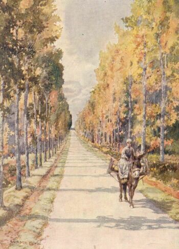 Although the only road that is depicted in this book is as straight as any built by the Romans and is bordered by poplars, it is only one type of the great routes nationales that connect the larger towns. In the hilly parts of Normandy the poplar bordered roads entirely disappear, and however straight the engineers may have tried to make their ways, they have been forced to give them a zig-zag on the steep slopes that breaks up the monotony of the great perspectives so often to be seen stretching away for great distances in front and behind. It must not be imagined that Normandy is without the usual winding country road where every bend has beyond it some possibilities in the way of fresh views. An examination of a good road map of the country will show that although the straight roads are numerous, there are others that wind and twist almost as much as the average English turnpike. As a rule, the route nationale is about the same width as most main roads, but it has on either side an equal space of grass. This is frequently scraped off by the cantoniers, and the grass is placed in great piles ready for removal. When these have been cleared away the thoroughfare is of enormous width, and in case of need, regiments could march in the centre with artillery on one side, and a supply train on the other, without impeding one another.