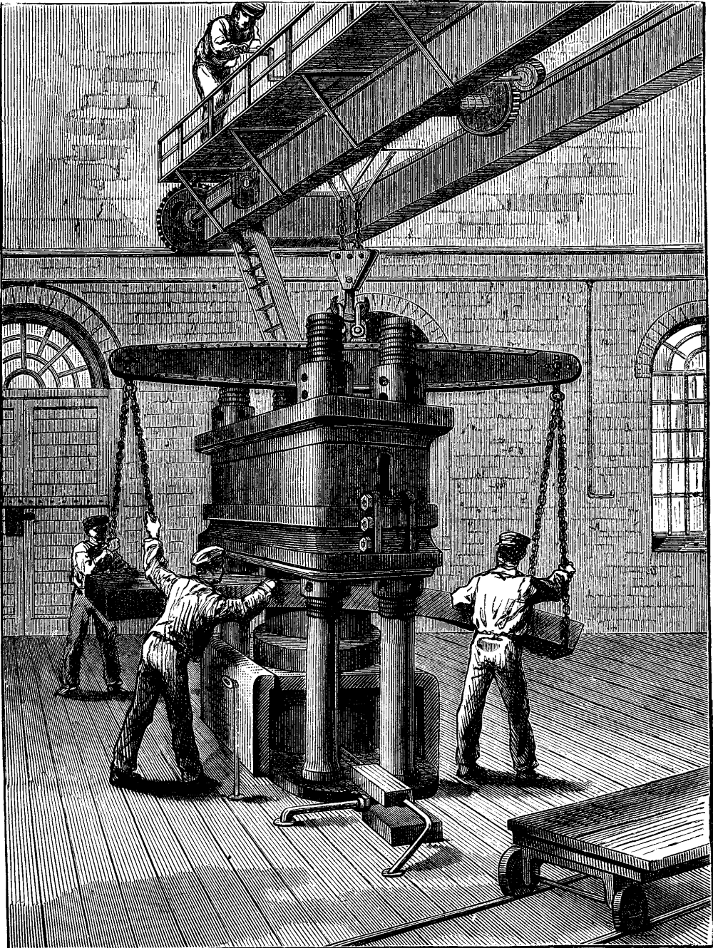 One may make himself a proximate idea of the enormous power of pressure of such a machine, if he can imagine what a strength is needed to bend an iron plate of 250 meters thickness, in cold condition; being also 1.5 meters in width, and 5.00 meters in length, and weighing about 14,555 kilogrammes, or 14,555 tons.