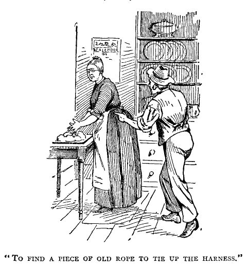 Twice I had to drop everything and find cloths to do up the horse's legs, where it had grazed 'em a-fallin' out of the machine. And once I took my hands out of the pie-crust to find a piece of old rope to tie up the harness. It seemed as if I left off every five minutes to wait on Josiah Allen, to find somethin' that he wanted and couldn't find, or else to do somethin' for him that he couldn't do.