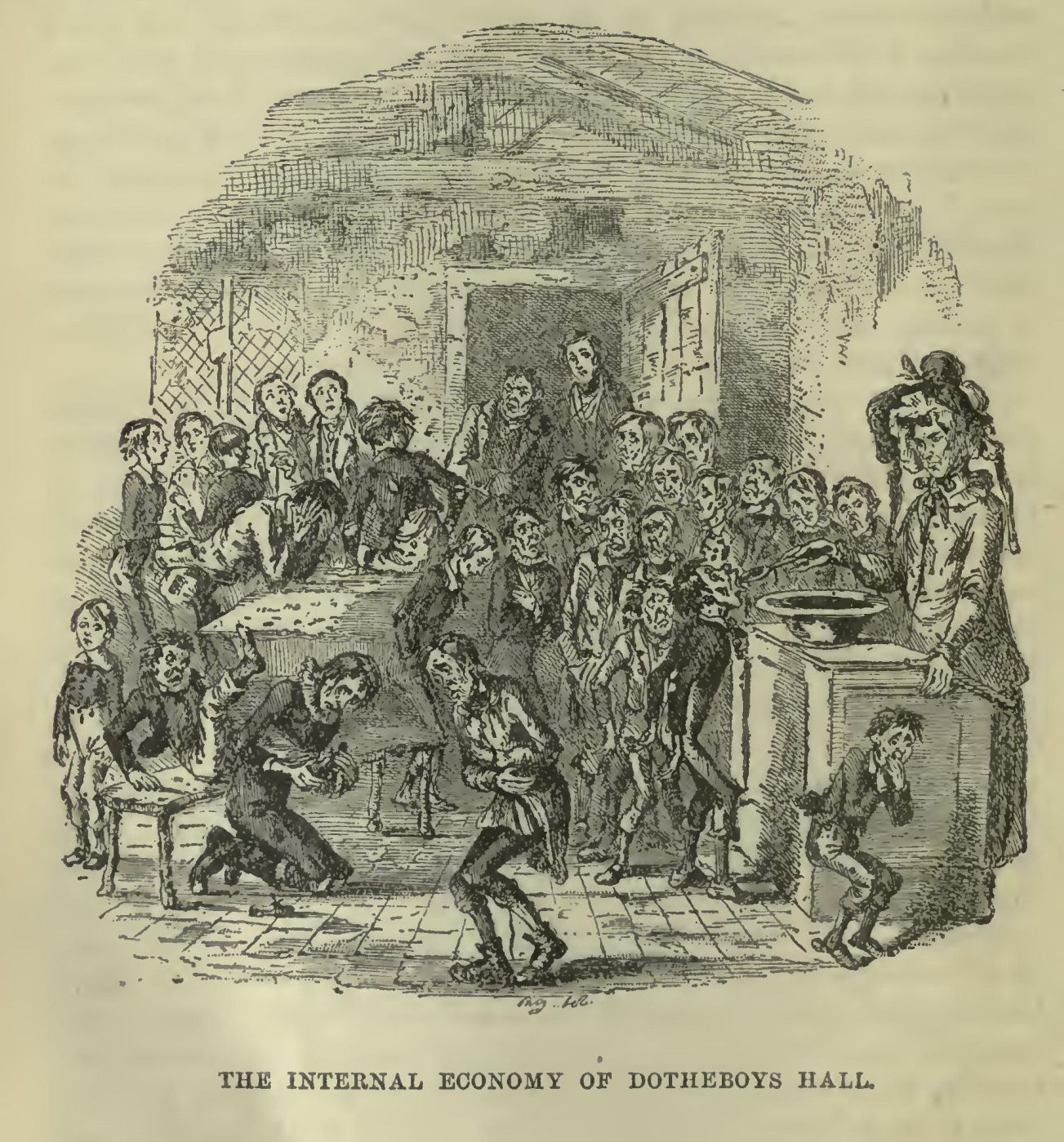 “The Author’s object in calling public attention to the system would be very imperfectly fulfilled, if he did not state now, in his own person, emphatically and earnestly, that Mr. Squeers and his school are faint and feeble pictures of an existing reality, purposely subdued and kept down lest they should be deemed impossible. That there are, upon record, trials at law in which damages have been sought as a poor recompense for lasting agonies and disfigurements inflicted upon children by the treatment of the master in these places, involving such offensive and foul details of neglect, cruelty, and disease, as no writer of fiction would have the boldness to imagine. And that, since he has been engaged upon these Adventures, he has received, from private quarters far beyond the reach of suspicion or distrust, accounts of atrocities, in the perpetration of which upon neglected or repudiated children, these schools have been the main instruments, very far exceeding any that appear in these pages.”