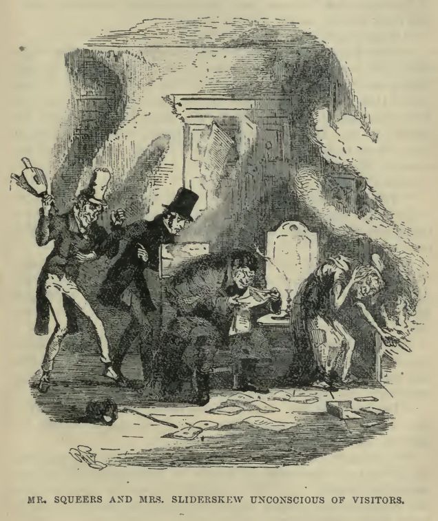 The new-comers were received with universal approbation, and Mr. Bonney bustled up to the top of the table, took off his hat, ran his fingers through his hair, and knocked a hackney-coachman’s knock on the table with a little hammer: whereat several gentlemen cried ‘Hear!’ and nodded slightly to each other, as much as to say what spirited conduct that was. Just at this moment, a waiter, feverish with agitation, tore into the room, and throwing the door open with a crash, shouted ‘Sir Matthew Pupker!’