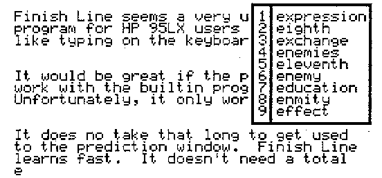 When in MS DOS, Finish Line learns the words and phrases you type into your HP 95LX and the likelihood of occurrence. Once Finish Line recognizes the first part of a word or phrase, it pops up a window with possible choices to complete the word or phrase. You pick one of these choices with a hot-key, or you keep on typing.