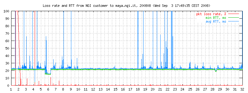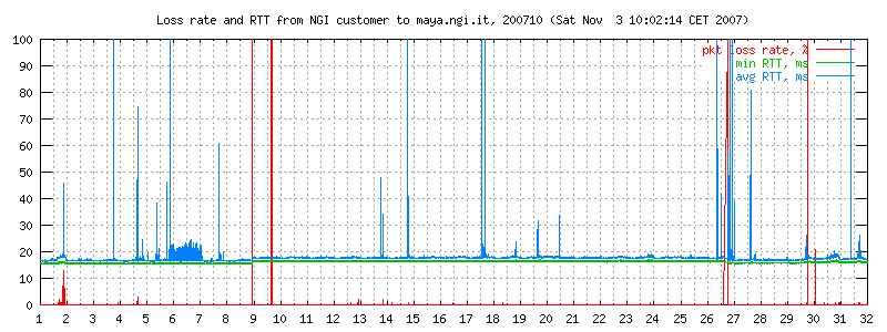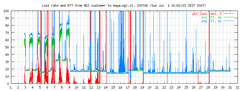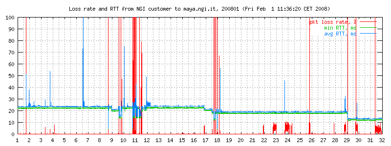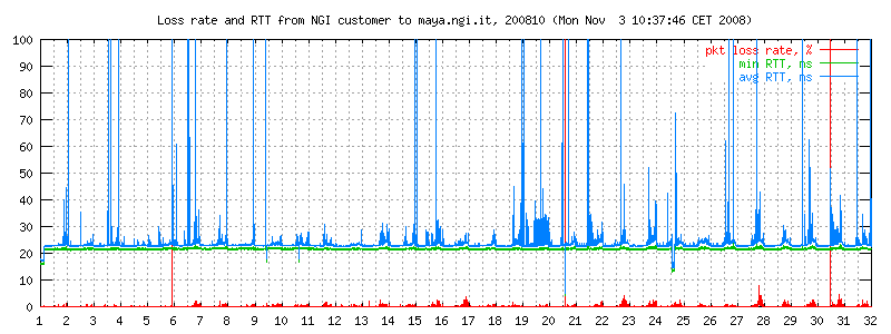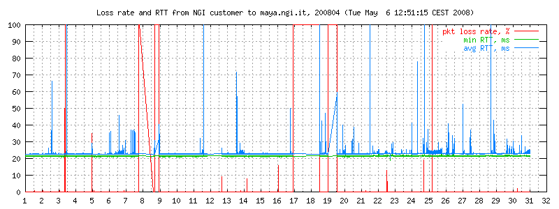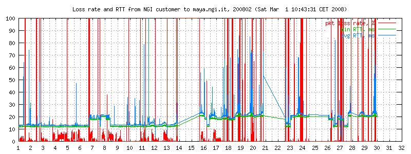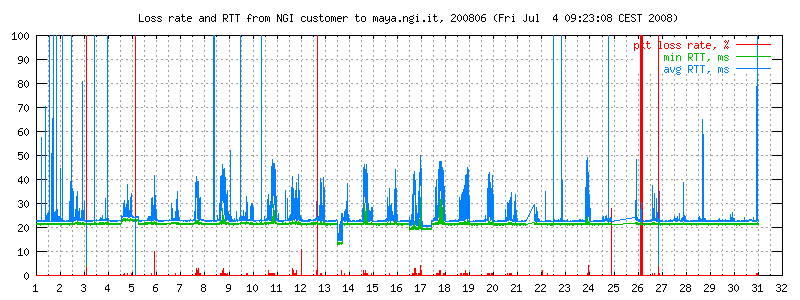 I dati sono misurati ogni due minuti con ping -i 0.1 -c 300 maya.ngi.it in modo da ottenere un campione significativo. Il traffico generato corrisponde a 10 pacchetti/640 bytes al secondo, e normalmente non esiste altro traffico sulla linea. I grafici rappresentano il round trip time minimo e medio, e (curva in basso) la loss rate. La linea è usata prevalentemente per traffico interattivo dell'ordine di pochi kbit/s.