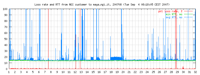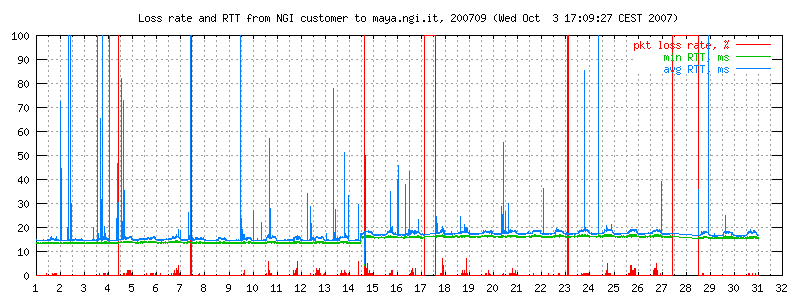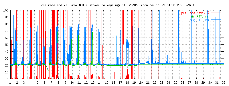 Apart from the trivia on the Telecomitalia technical support, the graphs below contain RTT and loss data over a number of months, and also a picture of the carrier state on my particular DSL line, which is affected by an annoying noise that regularly appears at 5.45 and disappears at midnight. See the full graphs.