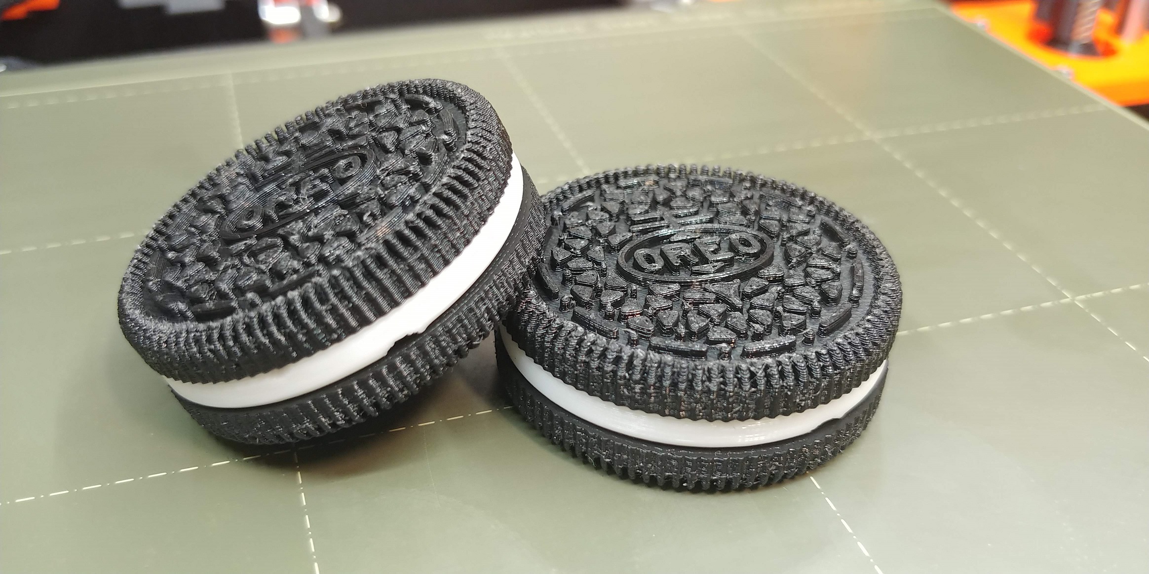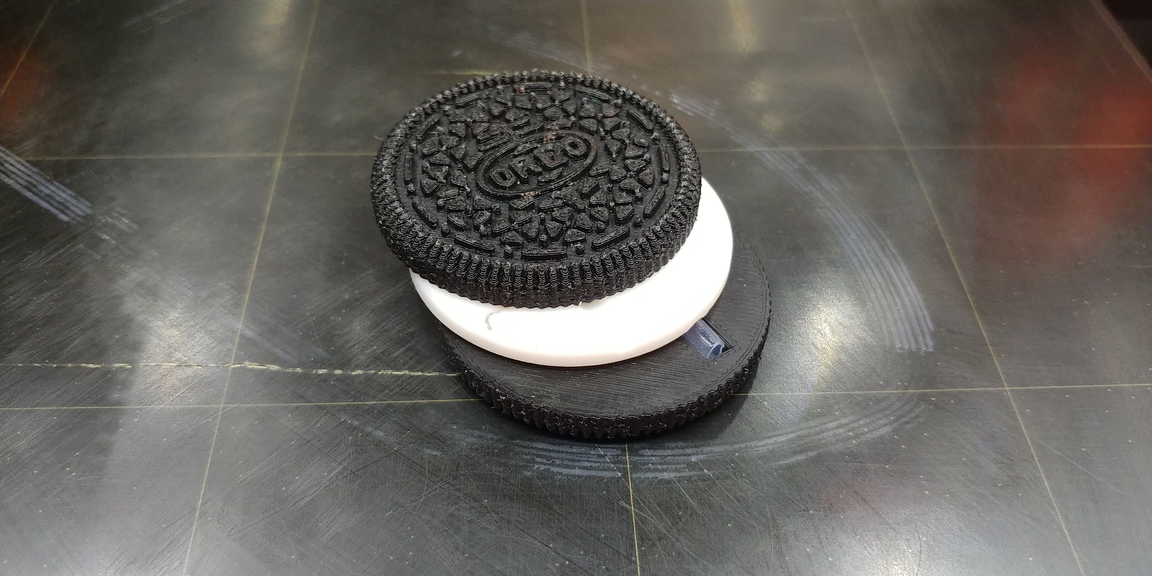 Note that this is my design and not available for home printing. However, it uses the free Oreo Cookie model which can be downloaded here for your own uses. https://www.thingiverse.com/thing:3391808
