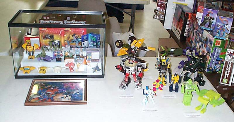 Well, the day has come and gone. Reports have been written, and the cat has forgotten what the inside of the bag even looks like. But hey, I took pictures, and I took video (with Richard's generous assistance), so I figure I might as well tell my story, if only to toss in one more perspective, as an organizer, attendee, and oft-times ringmaster. For my part, aside from being the numb-skull that said "Hey, how's about everyone in the area come hang out with me for a day?" 5 years ago, I contributed where I could. Starting with the reservation of the building 6 months ago, through all the "Yeah! let's do that!" replies to Richard's communications with crazysteve about the exclusive toys, the endless requests for Richard to tweak this and that on every inch of every panel of the box designs to suit my perfectionist artistic eye, which he begrudgingly yet skillfully made happen with his Photoshop magic, the over 50 photo-quality prints my printer churned out for me to carefully (perfectionist, remember?) trim out, fold up, and encase 45 toys in, my work truly encompassed only a small portion of it all. Zobovor has detailed his beautiful work on the character art, battle scene, and instruction booklet. Crazysteve has detailed his mind-boggling work on the breathtaking custom Bumblebee toy. Richard has glossed over the work he did on the box design somewhat... when I said endless requests for tweaking the design, I wasn't kidding... he probably won't do a box with my knowledge again. ;-) All that work came seamlessly together to be one of the most memorable Transformers conventions for all that attended, and possibly the best CybCon for a very long time to come. So what was it like on the day of? Well, I can only tell my side, so here we go. Who can sleep well the night before a big meeting they're hosting? Well, not me anyway. I packed most everything the night before so that I wouldn't need to get up too early. Even though I set an early alarm to make sure I was ready to go and there on time, I was wide awake hours before my alarm was set to go off. I figure I might as well get up and get ready, if only so I wasn't feeling like I was in a rush. I had planned to be there at 8:30, half an hour before the dealers were to begin setting up, but even with stopping for doughnuts and bags of ice, I was there at about 8:15. Not at all surprisingly, there were already a few people there. If my feeble memory doesn't fail me, there were about 6 people there, 2 or 3 were dealers. I opened the building and took a quick look around to form a plan of action. It didn't take long for more people to show up, dealers and attendees alike. I put up an "arrival order" sheet for people to sign when they arrive, rather than making people (including dealers) stand in line the entire time. The early dealers helped me set up the (fortunately) numerous included tables into an island and tables around the perimeter for the other dealers to occupy. Fortunately, we didn't need many more tables, and the empty spots there were were promptly filled. Every dealer had a spot, and we even had a small area left over (more on that later). With all the tables in place, dealers could pick their spot and start setting up. Richard and his lovely wife, Zeatha, who was an indispensible helper for the entire time, arrived shortly after and helped with setting things up and bringing things in. Joebot arrived a little late this year due to an unfortunate fight with food poisoning, so several of us helped him bring his stuff into the room so he could set up a little faster. Richard set up a table with my old 10 gallon fish tank turned over on top of a tiered shelf showing off past CybCon toys, this years toys and prototypes, as well as some other rare and delicate items, including my BotCon 2004 breakfast exclusive Breakdown. He also set out some of his newer TFs like Shockblast, Cliffjumper, Binaltech Hound, and test-shot Towline. I set up my tables blocking off the kitchen area and put on them my TV and PS2 for video games (starting with the PS2 Transformers game for people to play with), the raffle and auction items, and the sign up sheets for the Trivia and Beast Wars Transmetals game tournament. This was also the ill chosen setup for delivering pizza to hungry people at lunch time.... but I'll talk about that later. :\ Shortly before 10am I announced to the dealers that they needed to go get in line if they wanted an exclusive. The sign in sheet had done its work, and the dealers were able to take their place according to their arrival time. I made sure everyone was lined up, and that anyone who didn't register was waiting at the end of the line. Such is their punishment! hehe. Anyway, I opened the doors promptly at 10, and Zeatha was immediately put to work. To speed things up, and because I was an idiot who forgot to get change for the people who inevitably had only 20s and 50s so people ended up buying a ton of raffle tickets (price reduced to 2 tickets for a dollar!), Richard came over to help her pass out the toys as they were sold, and to count off raffle tickets. Fortunately, another dealer has a few bucks in change to help us along, but I think most people decided to go ahead and get their "change" in raffle tickets anyway. I kept an eye on Joebot's table, which was still being set up, as he was in line for a little longer than the other dealers. It didn't take long for things to be in full swing, with the building, effectively the dealer room, being full of busy collectors looking for their next deal. It was also not long before everyone waiting outside came in and decided to buy toys or not. What surprised me was that there were actually TWO Bumblebee toys left over! I took the opportunity to do what we had originally planned to snag them for auction and raffle. As I approached Zeatha at the sign-in table, someone came up to buy one of them, so I only got one, and decided to put it with the Auction items. 11am rolled around, 