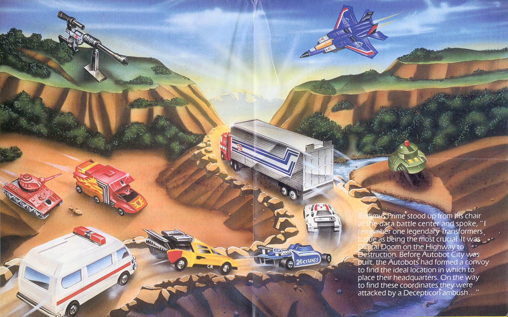 • Page One (151k) - Front and back cover art, which is one of the classic Transformers battle scenes, I think from one of the earliest box art, if not the first.