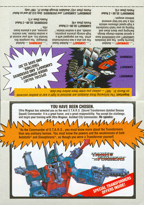 This one sells the STARS club, as well as the Omnibots, Sunstreaker, Wheeljack, Reflector, Thundercracker, Ratchet, and Mirage, as well as a couple TF video tapes. Approximate dimensions are 5-1/2" by 15" when fully opened.