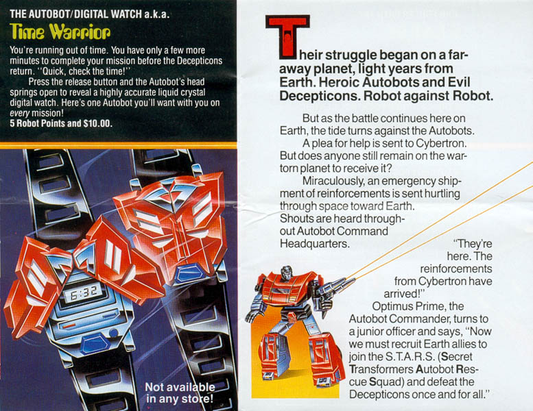 • Page Three (213k) - some text of the "story" in this flyer, plus pics and descriptions of Thundercracker, Reflector, and the S.T.A.R.S. club.
