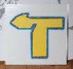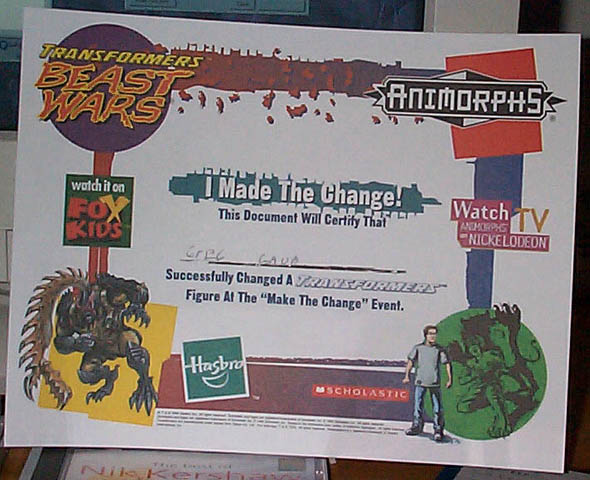 I transformed 'ol Stinkbomb as fast as I could, having only one practice run. He doesn't really have any tricky bits, so I wasn't fumbling... much. I managed to get it in 25 seconds. He informed me that I had been the fastest yet, while most of the others were 45 seconds or more. He asked my name, and wrote it down on the certificate (note the horrible penmanship) and proceeded to write down my name and time in a little notebook he had for everyone's info. He told me to come back at 2 to see if I had one, and that I had a pretty good chance since I was the fastest yet by a longshot. He also gave me a little temporary tattoo of the "T" from the new Transformers logo in Beast Machines. I got another one for my son, and was on my way.