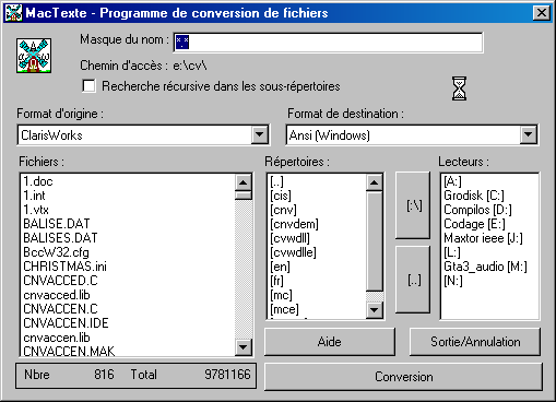 MacTexte est un petit programme de conversion sans prétentions, sachant traiter quelques formats qui, quoique courants sur le Macintosh, sont généralement ignorés superbement du côté PC.