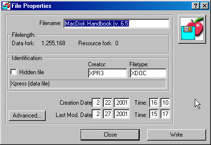 MacDisk now automatically detects BinHex and MacBinary files (for an example, Macintosh files downloaded from an Internet server) and proposes to apply the necessary treatment to the file to put all elements where they belong (data fork, resource fork, etc.) on the Macintosh medium.