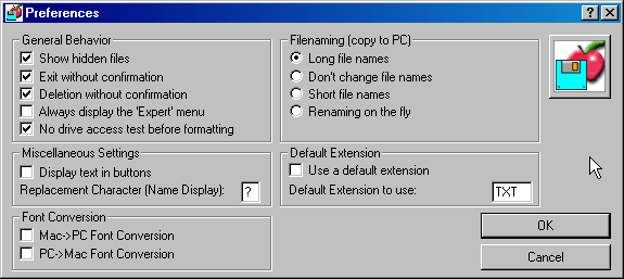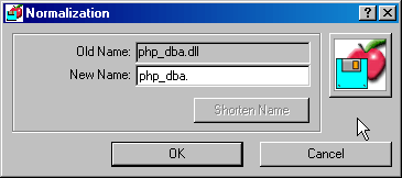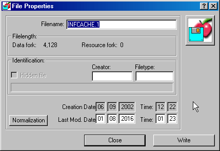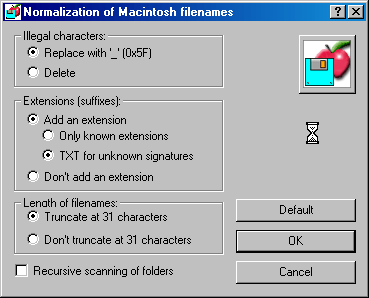 This dialog window launches an operation called "normalization". Normalizing means deleting all characters which are not allowed in the filename on a normal PC hard disk (they appear as question marks in the Explorer). MacDisk also adds extensions (suffixes) according to the signature of Macintosh files.