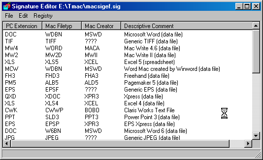 From the Expert menu, you can directly launch the signature editor, called SignEdit. This editor allows you to specify the correspondence between the PC extensions (suffixes) and Macintosh signatures. You can also correct the behavior of the program when a software publisher launches new versions or to add entries to the look-up table if you use rare formats.