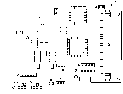 1. LCD Interface Connector 2. System-Expansion Port (120-pin) 3. Keyboard-Control Card Connector 4. Battery Presence Switch 5. LCD Interface Connector 6. LCD Interface Connector 8551 Planar,