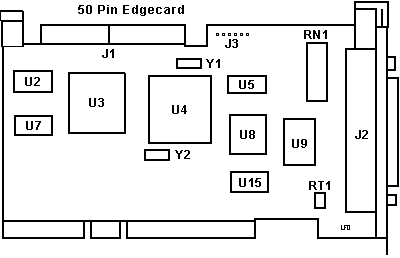 The actual cable itself is a standard SCSI-1 cable. The unusual part is the 50 pin edgecard connector. Note that Pin 1 on the adapter is towards the mounting bracket on the circuitboard side of the adapter. (the pin on the component side is marked "2").