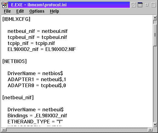 The key thing is to verify which adapter is associated with plain NetBIOS (ADAPTER1 = netbeui$) and which is associated with NetBIOS over TCP/IP (ADAPTER0 = tcpbeui$). These values should correspond with your choices made in the MPTS configuration program, but it pays to check. What you need this for is the editing of the \IBMLAN\IBMLAN.INI file, again on your OS/2 boot drive. For whatever reason, the MTPS configuration program will NOT update this file correctly. When you open the IBMLAN.INI file, look at the beginning of the file for records like: net1=NETBEUI$,0,LM10,100,150,14