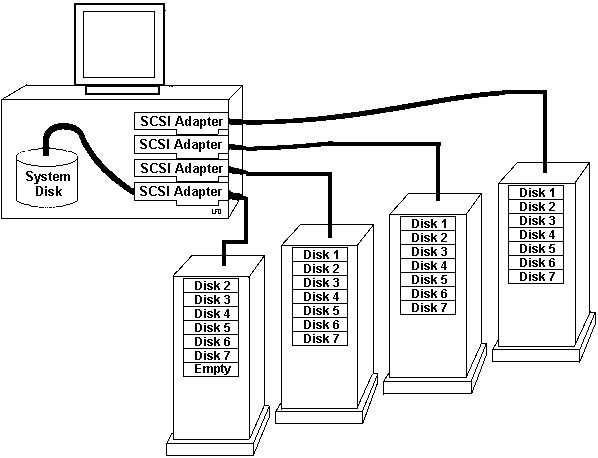 Ever ask yourself what you could do with a sixpack of beer, two servers, a bunch of data drives, and a collection of parts? Some of the following examples are based on a 9577 as a server. Note that the 85/95 series can use up to EIGHT SCSI adapters (NOT under W95 or Win 3.1x!). Still rooting for details on the software needed to run things in target mode. J. Clarke pointed out this High Availability Linux site Hacking NT4 Workstation for Fault Tolerance