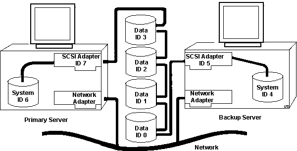 In this example, one SCSI adapter in each computer is attached to the shared set of six 3510 SCSI Storage Enclosures. The other SCSI controller is attached to the system hard disk. NOTE the SCSI IDs for the shared disk set- the two SCSI controllers attached to the disk set have different SCSI IDs (ID 7 and ID 6). Also, the IDs for each SCSI device involved with this disk set range from 0 to 7. NO DUPLICATE IDs ARE ALLOWED!!! My question- Do you only terminate the adapters? Sure can't terminate any of the drives.. Backup Server Using