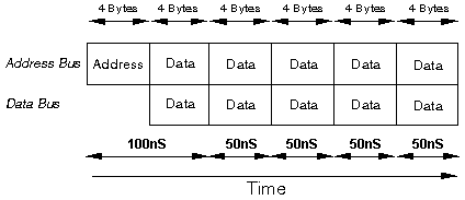 Basic Matched Memory Matched Memory w/o Wait Streaming Data Transfers 32 or 16 bit Streaming 64-bit Streaming 64-bit Streaming w/50ns Cycle Basic Data Transfer Cycle The basic transfer cycle works by first defining the address (in memory or I/O space) where a transfer is to occur, and then, in a second operation of equal length actually transferring the data. Each half of the operation (defining the address and data transfer) takes 100ns, or 200ns total. This process is repeated until the entire block of data has been transferred. Micro Channel - Basic Data Transfer (20MBps) shows basic data transfer in operation. Basic data transfer on the Micro Channel runs at 20MBps (each cycle takes 200 nanoseconds, and 32 bits or 4 bytes of data are transferred at a time). Five such “default” cycles can be performed in a millionth of a second. Each cycle moves four or two bytes per transfer, yielding a data transfer rate of 20MB/sec for 32-bit (4 byte) transfers or 10MB/s for 16-bit (2 byte) transfers. Basic Data Transfer 20MB/sec for